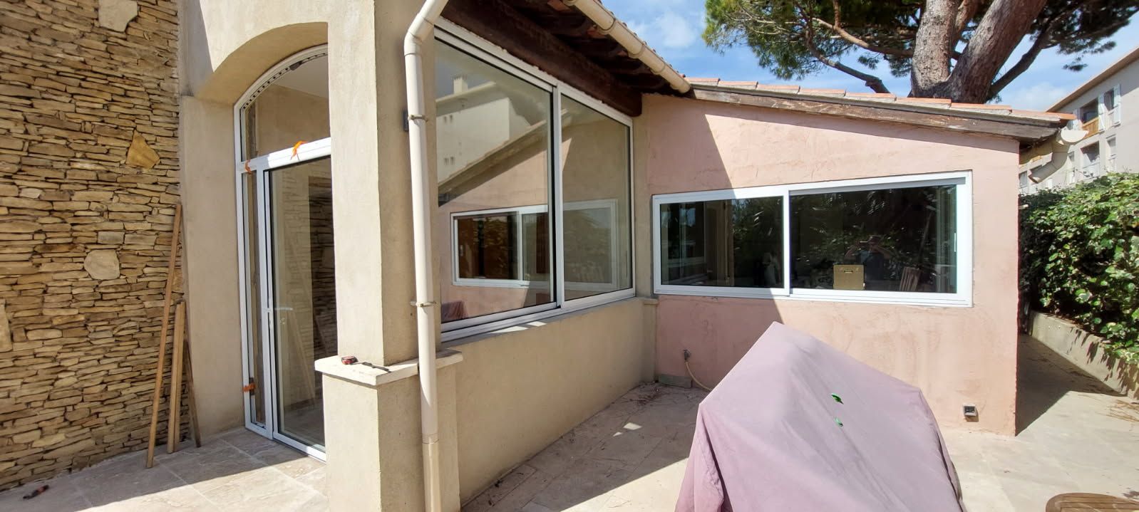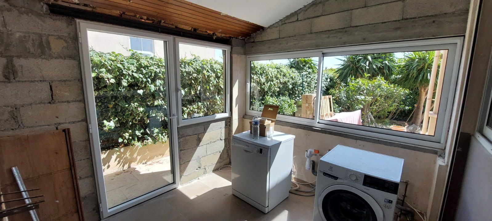 Réalisation d’un hall d’entrée avec porte vitrée et d’une cuisine avec porte vitrée et fenêtres coulissantes à Six-Fours-les-plages